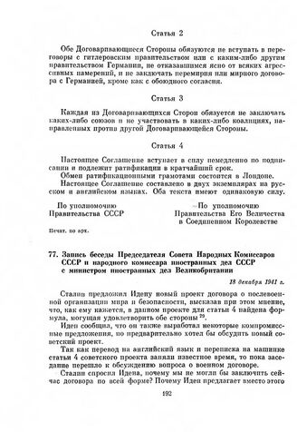 Запись беседы Председателя Совета Народных Комиссаров СССР и народного комиссара иностранных дел СССР с министром иностранных дел Великобритании. 18 декабря 1941 г. // Печат. по арх.