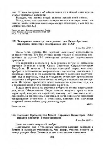 Послание Председателя Совета Народных Комиссаров СССР премьер–министру Великобритании. 8 ноября 1942 г. // Печат. по изд.: Переписка Председателя Совета Министров СССР с Президентами США и Премьер–Министрами Великобритании во время Великой Отечественной войны 1941–1945 гг. М., 1976, т. 1, с. 90.