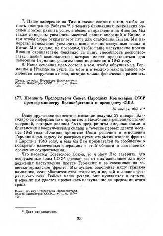 Послание Председателя Совета Народных Комиссаров СССР премьер–министру Великобритании и президенту США. 30 января 1943 г. // Печат. по изд.: Переписка Председателя Совета Министров СССР с Президентами США и Премьер–Министрами Великобритании во время Великой Отечественной войны 1941–1945 гг. М., 1976, т. 1, с. 107–108.