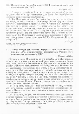 Запись беседы заместителя народного комиссара иностранных дел СССР с заместителем представителя Французского национального комитета в СССР. 10 августа 1943 г. // Печат. по арх.