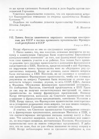 Запись беседы заместителя народного комиссара иностранных дел СССР с послом временного правительства Французской республики в СССР. 3 апреля 1945 г. // Печат. по арх.