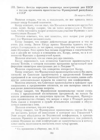 Запись беседы народного комиссара иностранных дел СССР с послом временного правительства Французской республики в СССР. 24 августа 1945 г. // Печат. по арх.