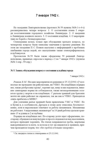 Запись обсуждения вопроса о состоянии кладбищ города. 7 января 1942 г. // ЦГА СПб. Ф. 7384. Оп. 18. Д. 1436. Л. 28–42. Стенограмма.