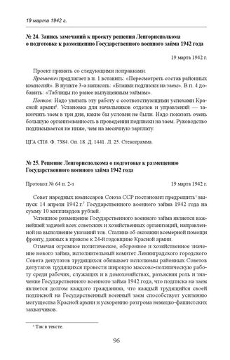 Решение Ленгорисполкома о подготовке к размещению Государственного военного займа 1942 года. Протокол № 64 п. 2-з. 19 марта 1942 г. // ЦГА СПб. Ф. 7384. Оп. 18. Д. 1441. Л. 23–24 об. Подлинник.