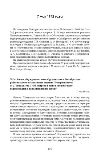 Запись обсуждения отчетов Фрунзенского и Октябрьского райисполкомов о выполнении решения Ленгорисполкома от 27 апреля 1942 г. «Об отогреве и пуске в эксплуатацию водопроводной и канализационной сетей». 7 мая 1942 г. // ЦГА СПб. Ф. 7384. Оп. 18. Д. 1443. Л. 10–14. Стенограмма.