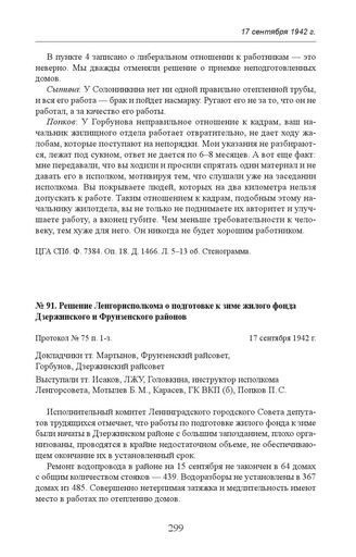 Решение Ленгорисполкома о подготовке к зиме жилого фонда Дзержинского и Фрунзенского районов. Протокол № 75 п. 1-з. 17 сентября 1942 г. // ЦГА СПб. Ф. 7384. Оп. 18. Д. 1466. Л. 1–1 об. Подлинник. Опубл.: БЛГСДТ. 1942. № 19. С. 1–2.