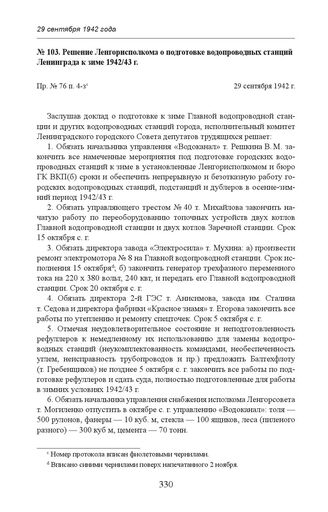 Решение Ленгорисполкома о подготовке водопроводных станций Ленинграда к зиме 1942/43 г. Пр. № 76 п. 4-з. 29 сентября 1942 г. // ЦГА СПб. Ф. 7384. Оп. 36. Д. 69. Л. 255–255 об. Подлинник.