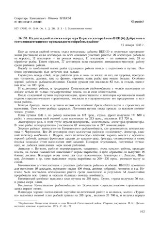 Из докладной записки секретаря Карагинского райкома ВКП(б) Дубранова о состоянии агитационно-пропагандистской работы в районе. 15 января 1943 г.