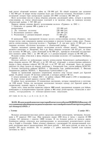 Из докладной записки секретарю Камчатского обкома ОК ВКП(б) Павлову «О состоянии партийной пропаганды и агитационно-массовой работы по Олюторскому району за 4-й квартал 1943 г.». с. Тилички. 12 декабря 1943 г. // КГУ ГАКК. Ф. П-2. Оп. 2. Д. 661. Л. 33-34. Машинописный подлинник.