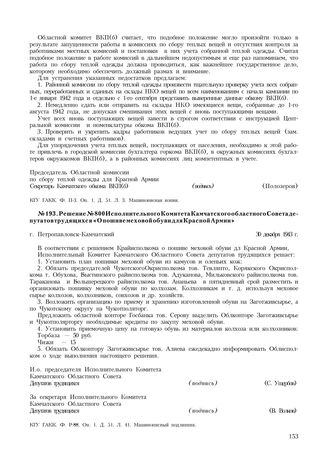 Решение №800 Исполнительного Комитета Камчатского областного Совета депутатов трудящихся «О пошиве меховой обуви для Красной Армии». г. Петропавловск-Камчатский. 30 декабря 1943 г.
