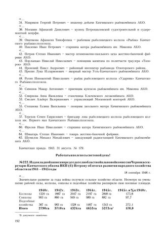 Из докладной записки председателя областной плановой комиссии Черняка секретарю Камчатского обкома ВКП(б) Петрову об итогах развития народного хозяйства области за 1941-1945 годы. 18 сентября 1946 г. // КГУ ГАКК. Ф. Р-67. Оп. 1. Д. 22. Л. 3-14. Машинописный подлинник.