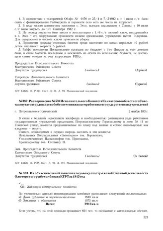 Распоряжение № 534 Исполнительного Комитета Камчатского областного Совета депутатов трудящихся об обеспечении жильем работников государственных учреждений. г. Петропавловск-Камчатский. 2 октября 1943 г.