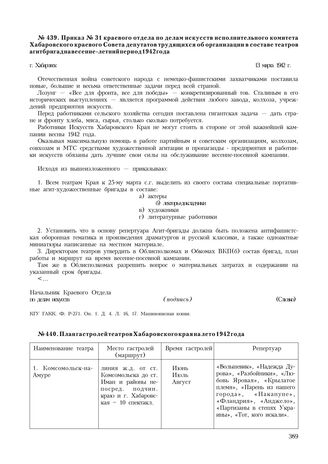 Приказ № 31 краевого отдела по делам искусств исполнительного комитета Хабаровского краевого Совета депутатов трудящихся об организации в составе театров агитбригад на весенне-летний период 1942 года. 13 марта 1942 г.