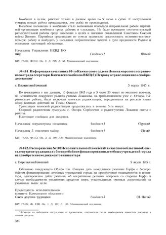 Информация начальника 60-го Камчатского ордена Ленина морского пограничного отряда секретарю Камчатского обкома ВКП(б) Петрову о трансляции японской радиостанции. г. Петропавловск-Камчатский. 5 марта 1945 г. // КГУ ГАКК. Ф. П-2. Оп. 2. Д. 799. Л. 9. Машинописный подлинник.