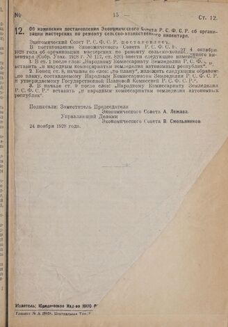 Постановление Экономического Совета. Об изменении постановления Экономического Совета РСФСР об организации мастерских по ремонту сельско-хозяйственного инвентаря. 24 ноября 1928 г.