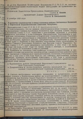 Постановление Экономического Совета. О развитии хлопководства в новых хлопковых районах Автономных Казакской и Киргизской Социалистических Советских Республик. 8 декабря 1928 г.