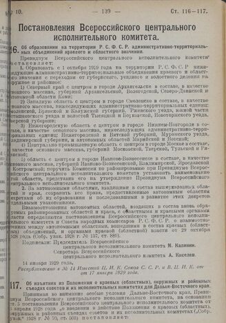 Постановление Всероссийского Центрального Исполнительного Комитета. Об изъятиях из положения о краевых (областных), окружных и районных съездах советов и их исполнительных комитетах для Дальне-Восточного края. 14 января 1929 г.