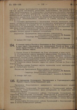 Постановление Всероссийского Центрального Исполнительного Комитета. Об упразднении Степновского, Кисловодского и Горячеводского районов, Терского округа, Северо-Кавказского края. 21 января 1929 г.