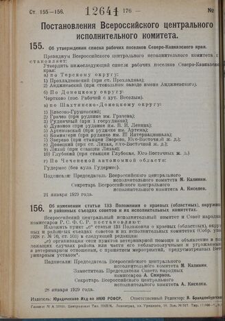 Постановление Всероссийского Центрального Исполнительного Комитета. Об утверждении списка рабочих поселков Северо-Кавказского края. 21 января 1929 г.