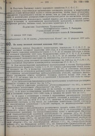 Постановление Экономического Совета. По плану весенней посевной кампании 1929 года. 19 января 1929 г.