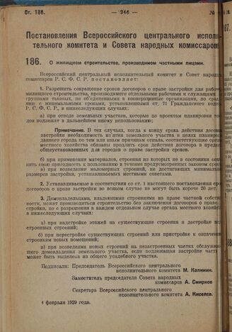 Постановление Всероссийского Центрального Исполнительного Комитета и Совета Народных Комиссаров. О жилищном строительстве, производимом частными лицами. 4 февраля 1929 г.