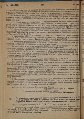 Постановление Совета Народных Комиссаров. Об изменении постановлений Совета народных комиссаров РСФСР от 20 сентября 1927 года и 8 декабря 1928 года о государственном нормировании заработной платы служащих государственных учреждений. 13 февраля 19...