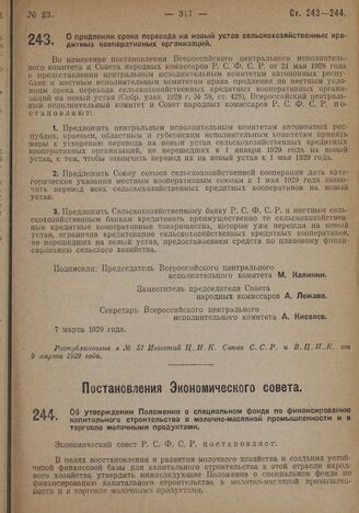 Постановление Экономического Совета. Об утверждении Положения о специальном фонде по финансированию капитального строительства в молочно-масляной промышленности и в торговле молочными продуктами. 14 февраля 1929 г.