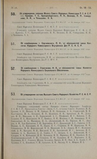 Об утверждении состава Высшего Совета Народного Хозяйства РСФСР. Постановление Совета Народных Комиссаров РСФСР от 19 января 1927 г.