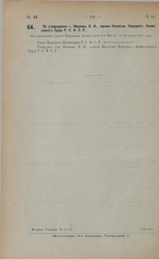 Главная Собрание законов и распоряжений правительства РСФСР и СССР Собрание законов и распоряжений Рабоче-Крестьянского Правительства ... Собрание узаконений и распоряжений Рабочего и Крестьянского правите... Собрание узаконений и распоряжений Рабоче-Крестьянского правительст... Документы Об утверждении т. Иванова, В.И., членом Коллегии Народного Комиссар...