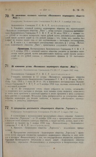 Об увеличении основного капитала «Московского акционерного общества „Мясо"». Утверждено Экономическим Совещанием РСФСР 9 октября 1926 г.