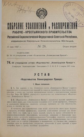 Об утверждении устава «Издательства „Ленинградская Правда"». Утвержден Экономическим Совещанием РСФСР 8 марта 1927 г.