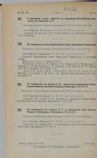 Об утверждении состава Всероссийского Совета Социального Страхования. Утверждено Советом Народных Комиссаров РСФСР 11 мая 1927 г.