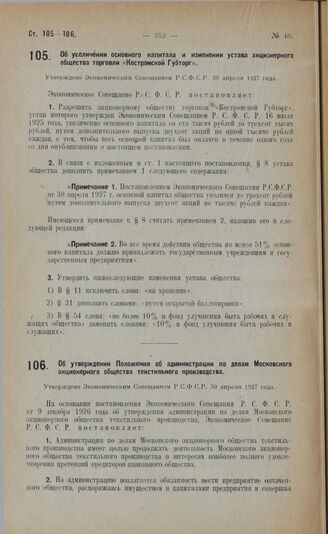 Об увеличении основного капитала и изменении устава акционерного общества торговли «Костромской Губторг». Утверждено Экономическим Совещанием РСФСР 30 апреля 1927 г.