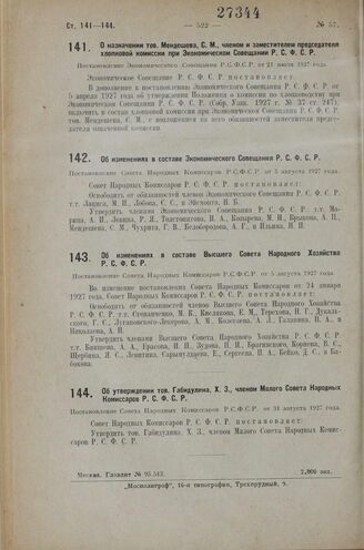 Об утверждении тов. Габидулина, X.3., членом Малого Совета Народных Комиссаров РСФСР. Постановление Совета Народных Комиссаров РСФСР от 31 августа 1927 г.