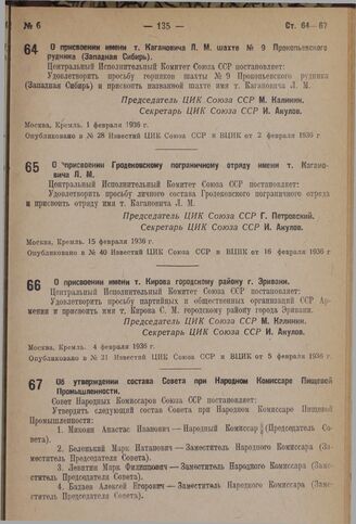 О присвоении имени т. Кирова городскому району г. Эривани. 4 февраля 1936 г. // Опубликовано в № 31 Известий ЦИК Союза ССР и ВЦИК от 5 февраля 1936 г.