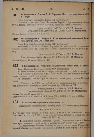 Об освобождении т. Гамбурга И. К. от обязанностей заместителя Главного арбитра при СНК Союза ССР. 13 марта 1936 г. № 489