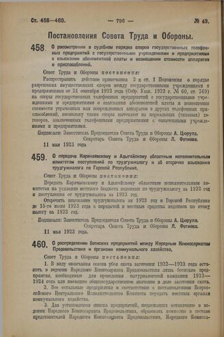 Постановление Совета Труда и Обороны. О распределении боенских предприятий между Народным Комиссариатом Продовольствия и органами коммунального хозяйства. 11 мая 1923 г.