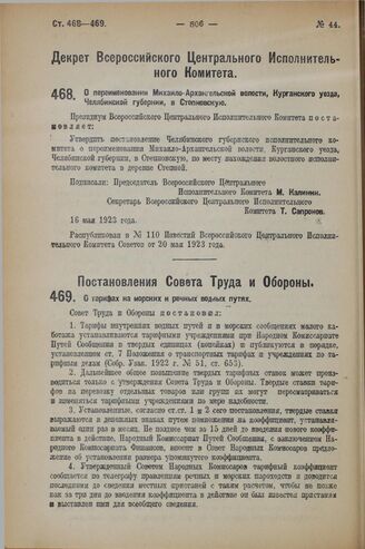 Постановление Совета Труда и Обороны. О тарифах на морских и речных водных путях. 16 мая 1923 г.