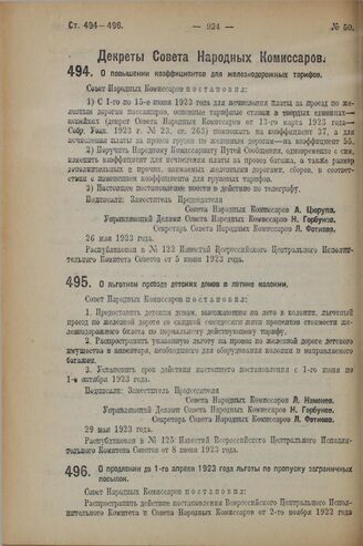 Декрет Совета Народных Комиссаров. О повышении коэффициентов для железнодорожных тарифов. 26 мая 1923 г. // Распубликован в № 122 Известий Всероссийского Центрального Исполнительного Комитета Советов от 5 июня 1923 г.
