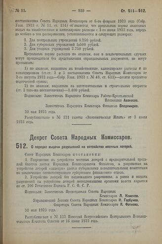 Декрет Совета Народных Комиссаров. О порядке выдачи разрешений на устройство местных лотерей. 31 мая 1923 г.