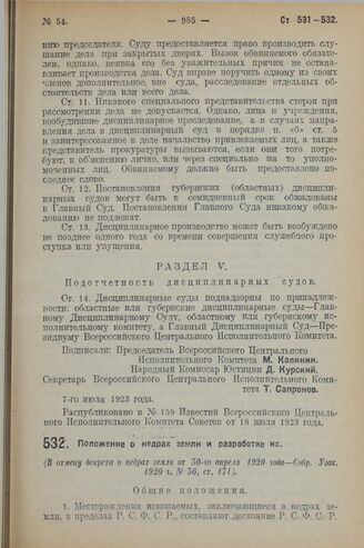 Постановление II сессии Всероссийского Центрального Исполнительного Комитета X созыва. Положение о недрах земли и разработке их. 7 июля 1923 г.