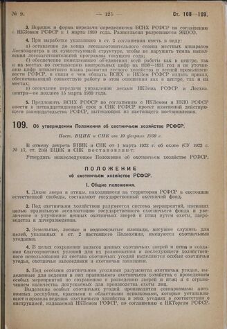 Об утверждении Положения об охотничьем хозяйстве РСФСР. Пост. ВЦИК и СНК от 10 февраля 1930 г.