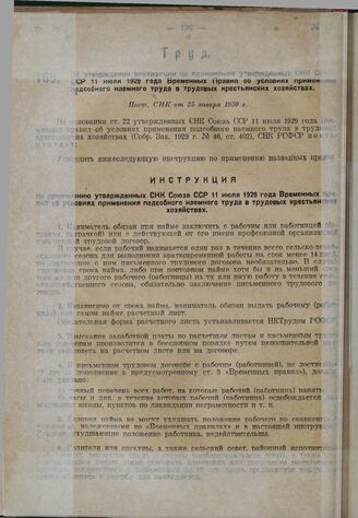 Об утверждении инструкции по применению утвержденных СНК Союза ССР 11 июля 1929 года Временных правил об условиях применения подсобного наемного труда в трудовых крестьянских хозяйствах. Пост. СНК от 25 января 1930 г.