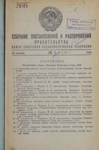 Собрание постановлений и распоряжений правительства СССР за 1943 г. № 1-14