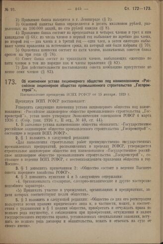 Об изменении устава акционерного общества под наименованием «Российское акционерное общество промышленного строительства „Госпромстрой"». Постановление президиума ВСНХ РСФСР от 15 января. 1929 г.