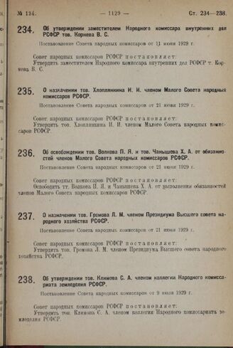 Об утверждении заместителем Народного комиссара внутренних дел РСФСР тов. Корнева В. С. Постановление Совета народных комиссаров от 11 июня 1929 г.
