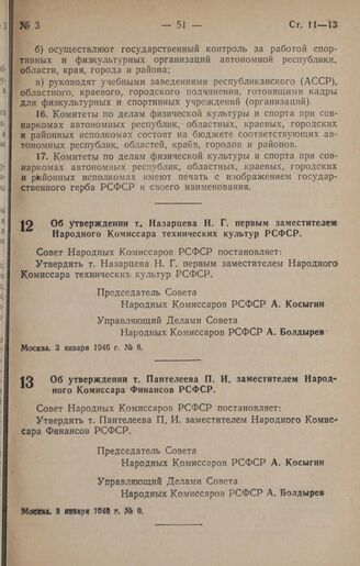 Постановление Совета Народных Комиссаров РСФСР. Об утверждении т. Назарцева Н. Г. первым заместителем Народного Комиссара технических культур РСФСР. 3 января 1946 г. № 8