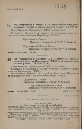 Постановление Совета Народных Комиссаров РСФСР. Об утверждении т. Алексеева заместителем Наркома и членом коллегии Наркомторга РСФСР и об освобождении от этой работы т. Жукова Н. А. 7 января 1946 г. № 17