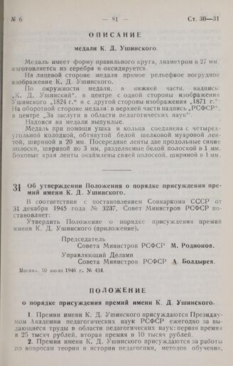 Постановление Совета Министров РСФСР. Об утверждении Положения о порядке присуждения премий имени К. Д. Ушинского. 10 июля 1946 г. № 434