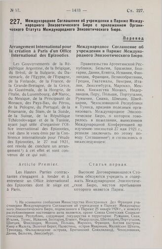 Международное Соглашение об учреждении в Париже Международного Эпизоотического Бюро с приложением Органического Статута Международного Эпизоотического Бюро. 25 января 1924 года